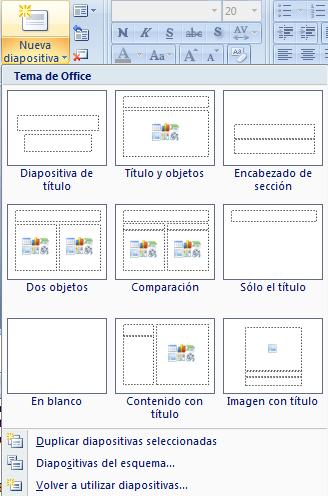 Como puedes ver en la imagen de la derecha, si hacemos clic en la flecha que se encuentra bajo el botón Nueva diapositiva, podremos elegir su diseño o tema.